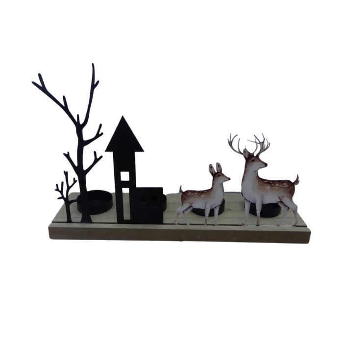 СВЕЩНИК 4-КА МЕТАЛЕН В/У МДФ С ЕЛЕНИ,КЪЩА,ДЪРВО 24*7,8*12см